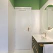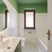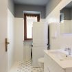 Two elegant bathrooms equipped with shower, bathtub, washing machine and dryer.